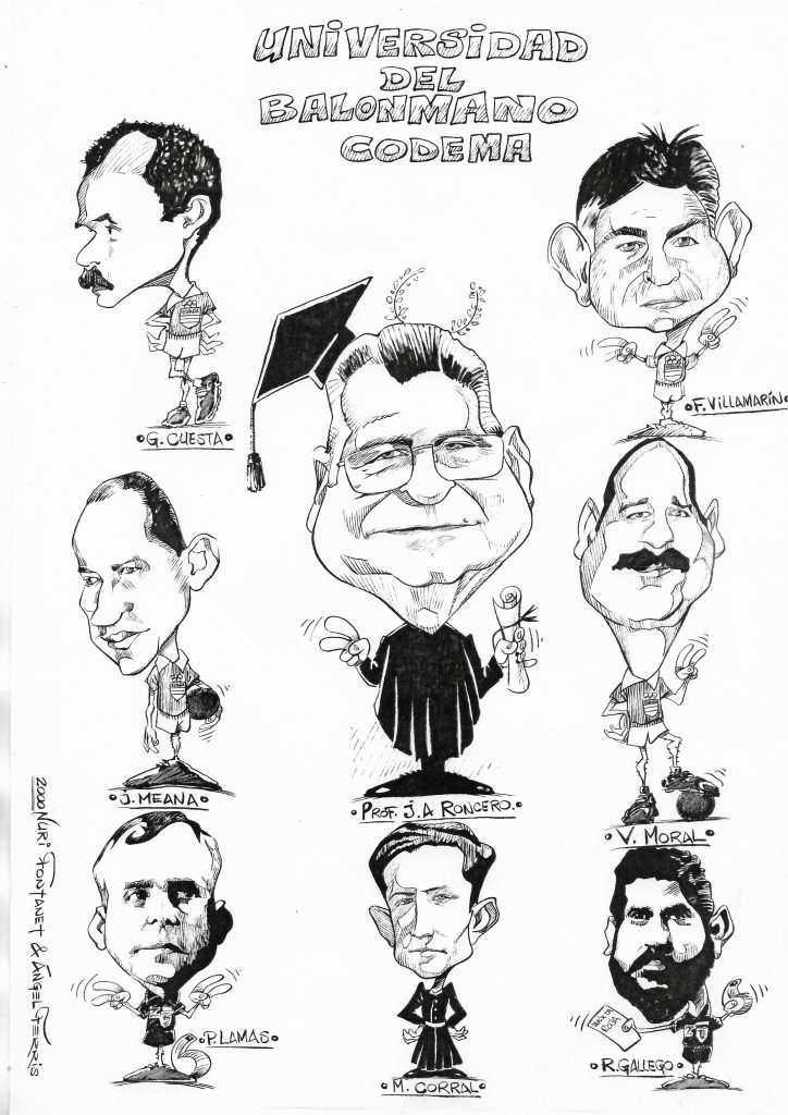 Caricatura creada para el homanaje a Antonio Roncero en el que figura Villamarín como «alumno» de Roncero